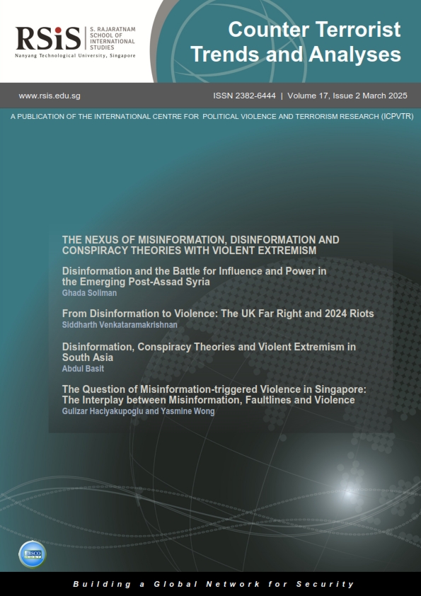 Against this backdrop, the current issue features four articles examining the role of misinformation, disinformation, and conspiracy theories in facilitating and fomenting violent extremism in Syria, the UK, South Asia, and Singapore. In the first article, Ghada Soliman examines the role of disinformation campaigns in the battle for influence and power in post-Assad Syria. Disinformation in support of Hay’at Tahrir al-Sham (HTS) emerged in the lead-up to the operation that took Damascus and have since proliferated to improve the group’s credibility as a legitimate and unifying authority. However, disinformation campaigns against HTS also exist, as other groups, such as the Southern Operation Room, the Syrian Democratic Forces, and the Islamic State terrorist group, continue to vie for power. Disinformation campaigns will likely persist amidst this rivalry, obfuscating public perception and further polarising communities in Syria.