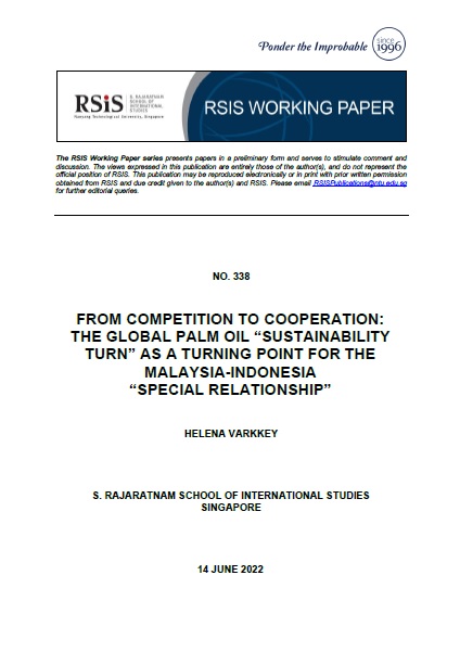 Palm oil is the source of a common identity between Malaysia and Indonesia, the two largest palm oil producers globally. As with many other socio-cultural aspects of the Malaysia-Indonesia “special relationship”, palm oil has also led to heightened competition between both nations. However, recent negative sentiments towards palm oil originating from sustainability-conscious markets in the north have threatened both states’ access to important export markets. This paper examines how these developments have marked an important turning point in Malaysia-Indonesia relations. Faced with such external pressures, both states are now increasingly reliant on each other’s continued prominence for their own market survival — their shared strategic interests tending to facilitate cooperation instead of conflict or competition. This paper takes the Malaysian perspective in illustrating the shift from competition to cooperation within the palm oil sector. Of particular interest are the issues over transboundary haze, where Malaysia’s responses have been increasingly geared towards appeasement, restrained by concerns about related fallouts in the palm oil sector.