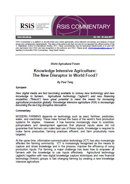 Paul Teng is Adjunct Senior Fellow at the Centre for Non-Traditional Security (NTS) Studies, S. Rajaratnam School of International Studies (RSIS), Nanyang Technological University. He formerly held leadership positions at The WorldFish Centre, The International Rice Research Institute and Monsanto Company. This is the first in a series on the upcoming World Agricultural Forum (WAF) organised jointly with the S.Rajaratnam School of International Studies (RSIS), Nanyang Technological University, Singapore.