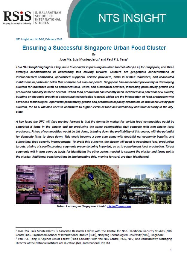 Urban food production has recently been identified as a potential new cluster for Singapore, building on the rapid growth of agricultural technologies which are the intersection of food production with advanced technologies. Clusters are geographic concentrations of interconnected companies, specialized suppliers, service providers, firms in related industries, and associated institutions in particular fields that compete but also cooperate. Singapore has succeeded previously in developing clusters for industries such as petrochemicals, water, and biomedical services, increasing productivity growth and production capacity in these sectors. However, apart from productivity growth and production capacity expansion, as was achieved by past clusters, the urban food cluster will also seek to contribute to higher levels of food self-sufficiency and food security in the city-state. This NTS Insight highlights a key issue and three strategic considerations in pursuing an urban food cluster for Singapore.