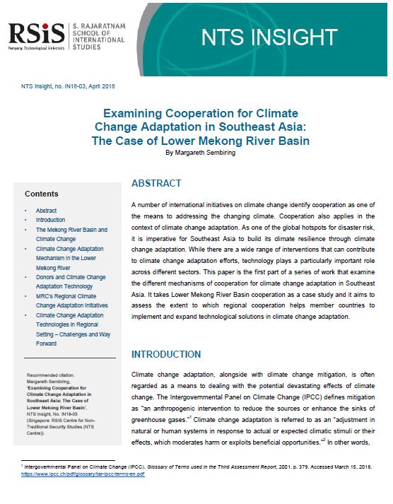 A number of international initiatives on climate change identify cooperation as one of the means to addressing the changing climate. Cooperation also applies in the context of climate change adaptation. As one of the global hotspots for disaster risk, it is imperative for Southeast Asia to build its climate resilience through climate change adaptation. While there are a wide range of interventions that can contribute to climate change adaptation efforts, technology plays a particularly important role across different sectors. This paper is the first part of a series of work that examine the different mechanisms of cooperation for climate change adaptation in Southeast Asia. It takes Lower Mekong River Basin cooperation as a case study and it aims to assess the extent to which regional cooperation helps member countries to implement and expand technological solutions in climate change adaptation.
