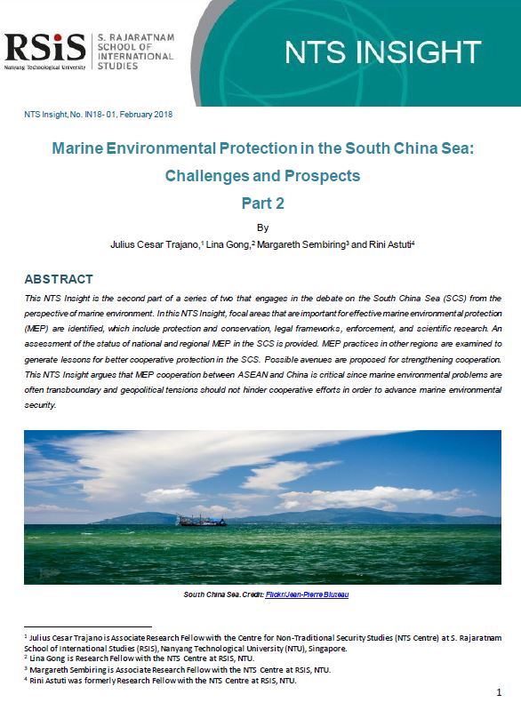 This NTS Insight is the second part of a series of two that engages in the debate on the South China Sea (SCS) from the perspective of marine environment. In this NTS Insight, focal areas that are important for effective marine environmental protection (MEP) are identified, which include protection and conservation, legal frameworks, enforcement, and scientific research. An assessment of the status of national and regional MEP in the SCS is provided. MEP practices in other regions are examined to generate lessons for better cooperative protection in the SCS. Possible avenues are proposed for strengthening cooperation. This NTS Insight argues that MEP cooperation between ASEAN and China is critical since marine environmental problems are often transboundary and geopolitical tensions should not hinder cooperative efforts in order to advance marine environmental security.