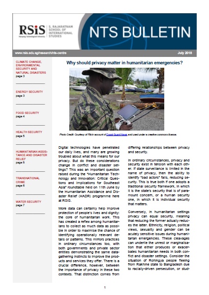 Digital technologies have penetrated our daily lives, and many are growing troubled about what this means for our privacy. But do these considerations change in conflict and disaster settings? This was an important question raised during the “Humanitarian Technology and Innovation: Critical Questions and Implications for Southeast Asia” roundtable held on 11th June by the Humanitarian Assistance and Disaster Relief (HADR) programme here at RSIS.