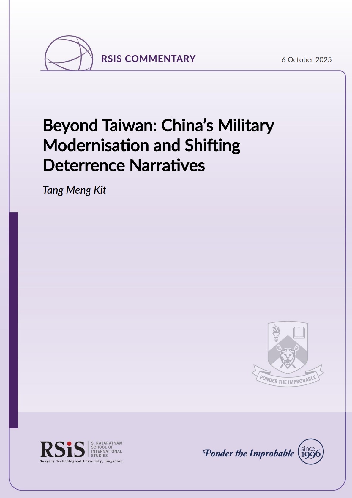 Tang Meng Kit is an aerospace engineer. He is an alumnus of the S. Rajaratnam School of International Studies (RSIS) at Nanyang Technological University (NTU). His research interests include cross-Strait relations, Taiwan politics and policy issues, and aerospace technology.