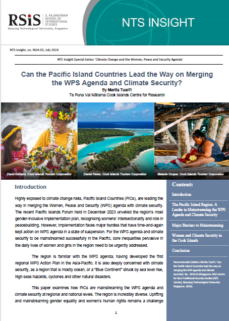 This paper examines how PICs are mainstreaming the WPS agenda and climate security at regional and national levels. The region is incredibly diverse. Uplifting and mainstreaming gender equality and women’s human rights remains a challenge across the region. Using the example of the Cook Islands, a large ocean state and one of only two countries in the Pacific classified as high income, we begin to see how core inequalities can keep these climate-vulnerable nations from meeting regional commitments on women and climate security.