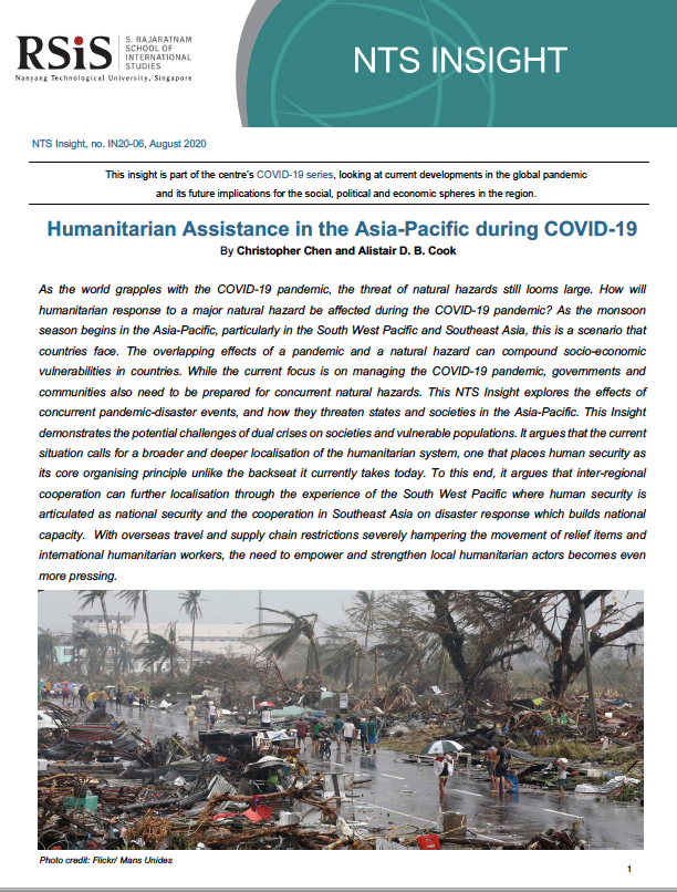 As the world grapples with the COVID-19 pandemic, the threat of natural hazards still looms large. How will humanitarian response to a major natural hazard be affected during the COVID-19 pandemic? As the monsoon season begins in the Asia-Pacific, particularly in the South West Pacific and Southeast Asia, this is a scenario that countries face. The overlapping effects of a pandemic and a natural hazard can compound socio-economic vulnerabilities in countries. While the current focus is on managing the COVID-19 pandemic, governments and communities also need to be prepared for concurrent natural hazards. This NTS Insight explores the effects of concurrent pandemic-disaster events, and how they threaten states and societies in the Asia-Pacific. This Insight demonstrates the potential challenges of dual crises on societies and vulnerable populations. It argues that the current situation calls for a broader and deeper localisation of the humanitarian system, one that places human security as its core organising principle unlike the backseat it currently takes today. To this end, it argues that inter-regional cooperation can further localisation through the experience of the South West Pacific where human security is articulated as national security and the cooperation in Southeast Asia on disaster response which builds national capacity. With overseas travel and supply chain restrictions severely hampering the movement of relief items and international humanitarian workers, the need to empower and strengthen local humanitarian actors becomes even more pressing.
