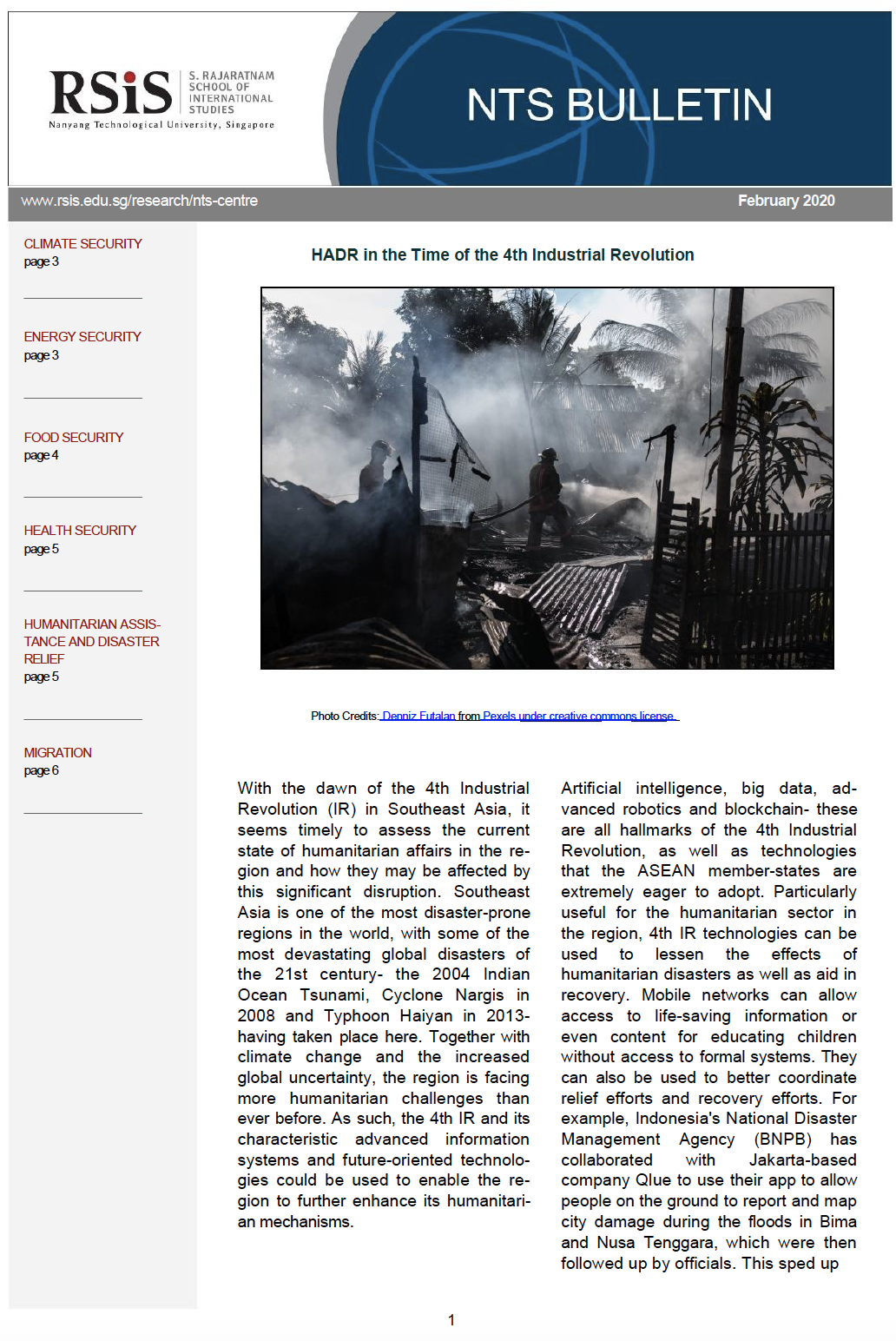 With the dawn of the 4th Industrial Revolution (IR) in Southeast Asia, it seems timely to assess the current state of humanitarian affairs in the region and how they may be affected by this significant disruption. Southeast Asia is one of the most disaster-prone regions in the world, with some of the most devastating global disasters of the 21st century- the 2004 Indian Ocean Tsunami, Cyclone Nargis in 2008 and Typhoon Haiyan in 2013- having taken place here. Together with climate change and the increased global uncertainty, the region is facing more humanitarian challenges than ever before. As such, the 4th IR and its characteristic advanced information systems and future-oriented technologies could be used to enable the region to further enhance its humanitarian mechanisms.