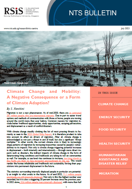 Migration is not a new phenomenon. As of mid-2020, there are an estimated 281 million people who are international migrants. Due in part to easier travel options and methods of communication with those at home, people are moving around the world more than ever before. Common reasons for migration include better livelihood opportunities, study opportunities, escaping persecution, and displacement as a result of conflict/disasters. With climate change steadily climbing the list of most pressing threats to humanity as seen in the 2023 Global Risks Report, it is therefore prudent to take into account its effect on drivers of migration. After all, climate change is acknowledged as not just a threat in and of itself, but also a significant “threat multiplier.” In other words, the current climate crisis is likely to increasingly shape patterns of migration by increasing insecurities caused by people’s vulnerabilities to its impacts. Not only is climate change triggering potential increases in displacement – both internally and internationally – through more direct impacts such as disasters, the indirect impacts of climate change in the form of deteriorating living conditions and livelihoods are taking its toll on communities as well. For example, as sea-level rise continues to increase, low-lying islands in the Pacific are likely to face increasing encroachment by the sea. This would render the homes inhabitable and livelihoods not sustainable, forcing their populations into permanent displacement in the future.