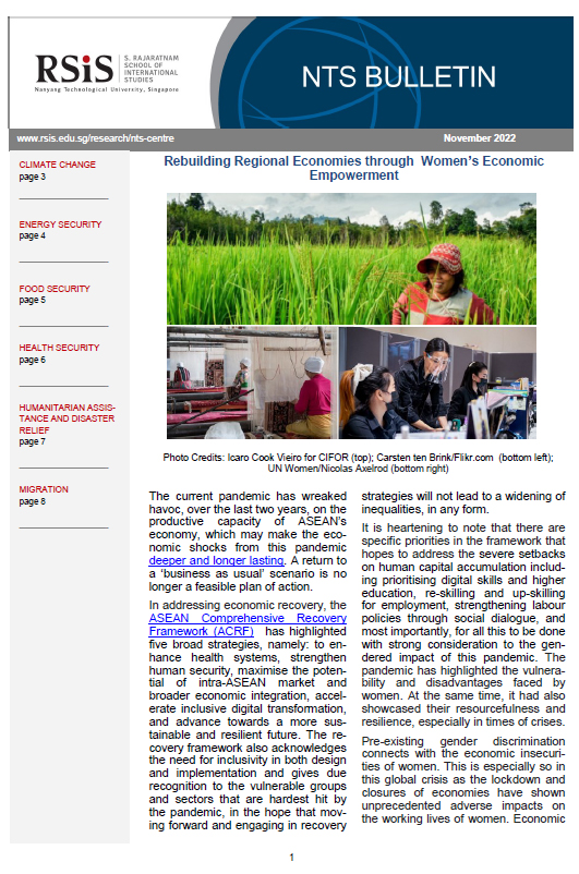 In addressing economic recovery, the ASEAN Comprehensive Recovery Framework (ACRF) has highlighted five broad strategies, namely: to enhance health systems, strengthen human security, maximise the potential of intra-ASEAN market and broader economic integration, accelerate inclusive digital transformation, and advance towards a more sustainable and resilient future. The recovery framework also acknowledges the need for inclusivity in both design and implementation and gives due recognition to the vulnerable groups and sectors that are hardest hit by the pandemic, in the hope that moving forward and engaging in recovery strategies will not lead to a widening of inequalities, in any form.