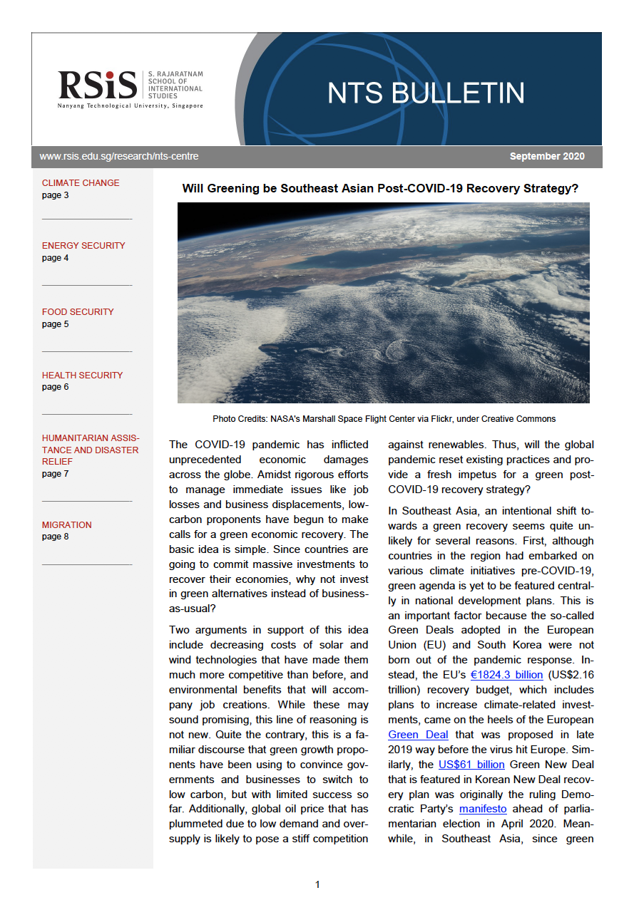 Second, considering the urgent need to get national economy rebound to its growth trajectory, governments in Southeast Asia are likely to fall back on existing development plans and accelerate sectors that directly contribute to that end. If sustainability was already integrated within the priority sectors, it will tag along. For example, Indonesia has identified B30 bio-diesel production, which was actually planned pre-COVID-19, as part of its recovery strategy. Its prioritisation thus will contribute to Indonesia’s climate mitigation agenda. Similarly, Malaysia opted to continue with its existing Large Scale Solar scheme to assist the country’s economic recovery. Likewise, in Singapore, US$2 billion had been allocated for green financing pre-COVID-19. Since climate solutions are part of Singapore’s current economic expansion plan, the prioritisation of environmental sustainability in the economic recovery will contribute to Singapore’s climate action progress.