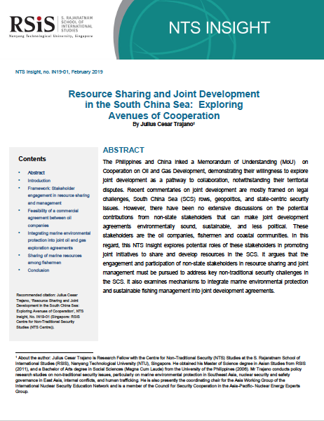 The Philippines and China signed a Memorandum of Understanding (MoU) in Cooperation on Oil and Gas Development, demonstrating their willingness to explore joint development as a pathway to collaboration, notwithstanding their territorial disputes. Recent commentaries on joint development are mostly framed on legal challenges, South China Sea (SCS) rows, geopolitics, and state-centric security issues. However, there have been no extensive discussions on the potential contributions from non-state stakeholders that can make joint development agreements environmentally sound, sustainable, and less political. These stakeholders are the oil companies, fishermen and coastal communities. In this regard, this NTS Insight explores potential roles of these stakeholders in promoting joint initiatives to share and develop resources in the SCS. It argues that the engagement and participation of non-state stakeholders in resource sharing and joint management must be pursued to address key non-traditional security challenges in the SCS. It also examines mechanisms to integrate marine environmental protection and sustainable fishing management into joint development agreements.